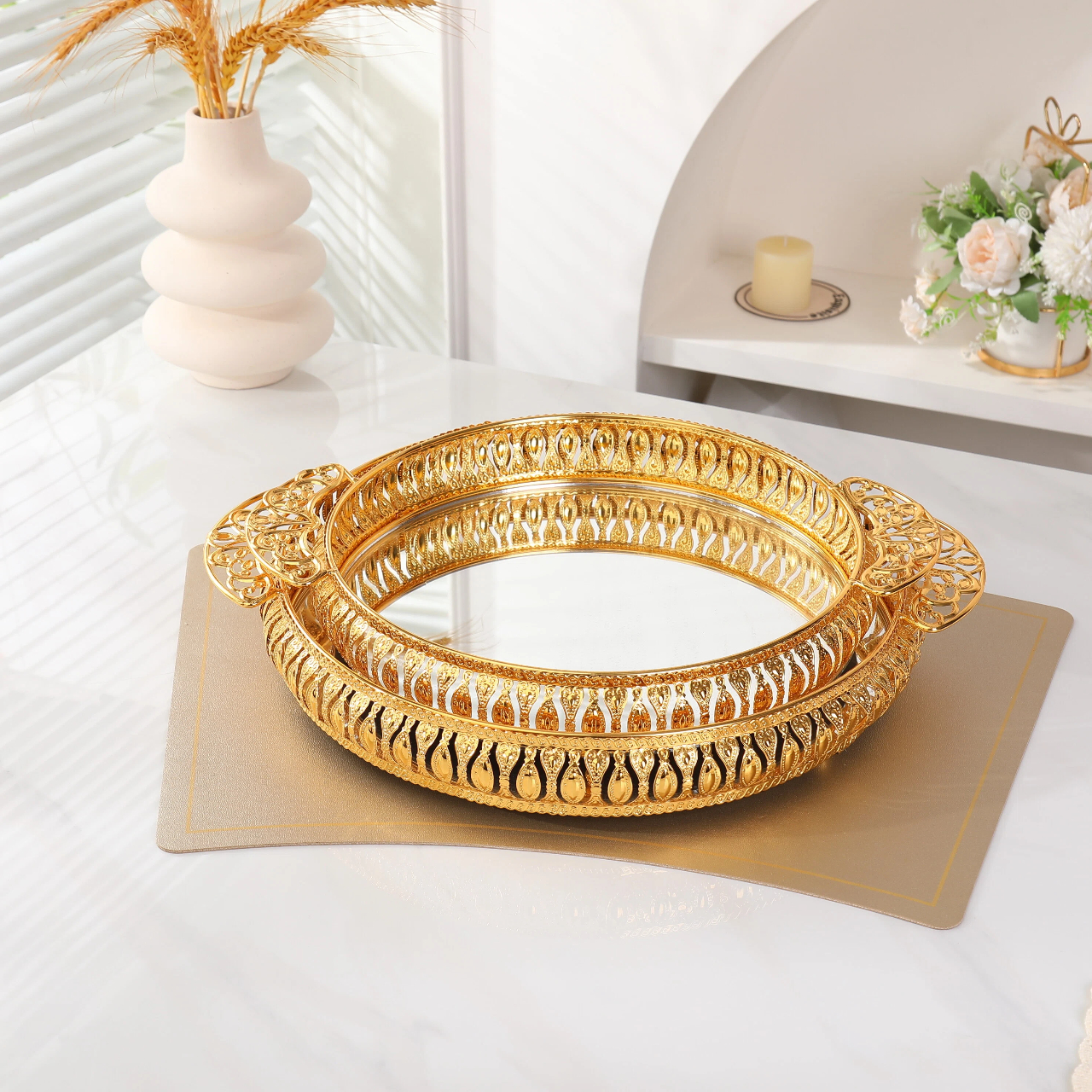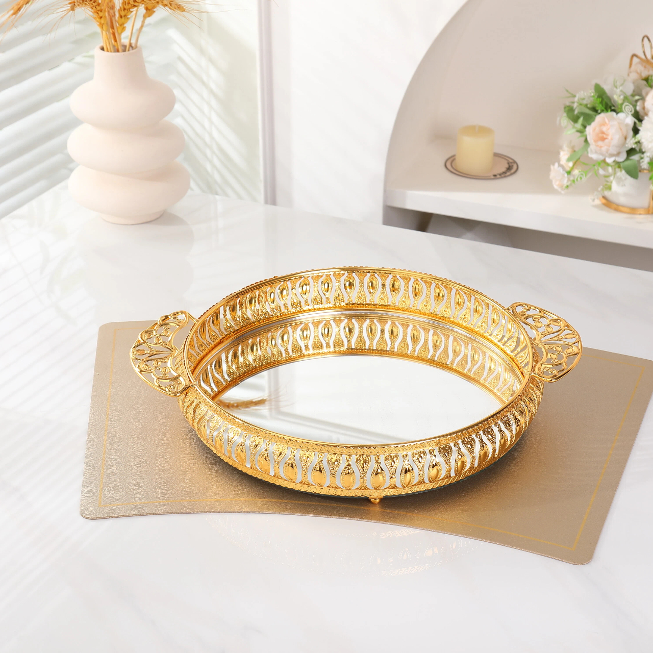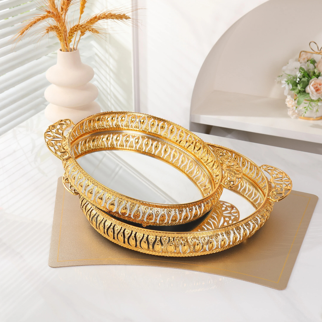 Это коллекция металлических подносов в ярко выраженном европейском стиле роскоши. Изготовленные из высококачественного сплава, они украшены изысканной ажурной гравировкой и золочением, что придает им роскошный золотистый блеск и нежные цветочные детали. В коллекции представлены подносы различных форм: овальные, круглые и прямоугольные. Некоторые модели дополнены стеклянными или зеркальными подносами, сочетающими практичность и эстетику. Ажурные узоры по краям подносов отличаются замысловатым и изысканным дизайном, а резные ручки придают им изысканный вид.