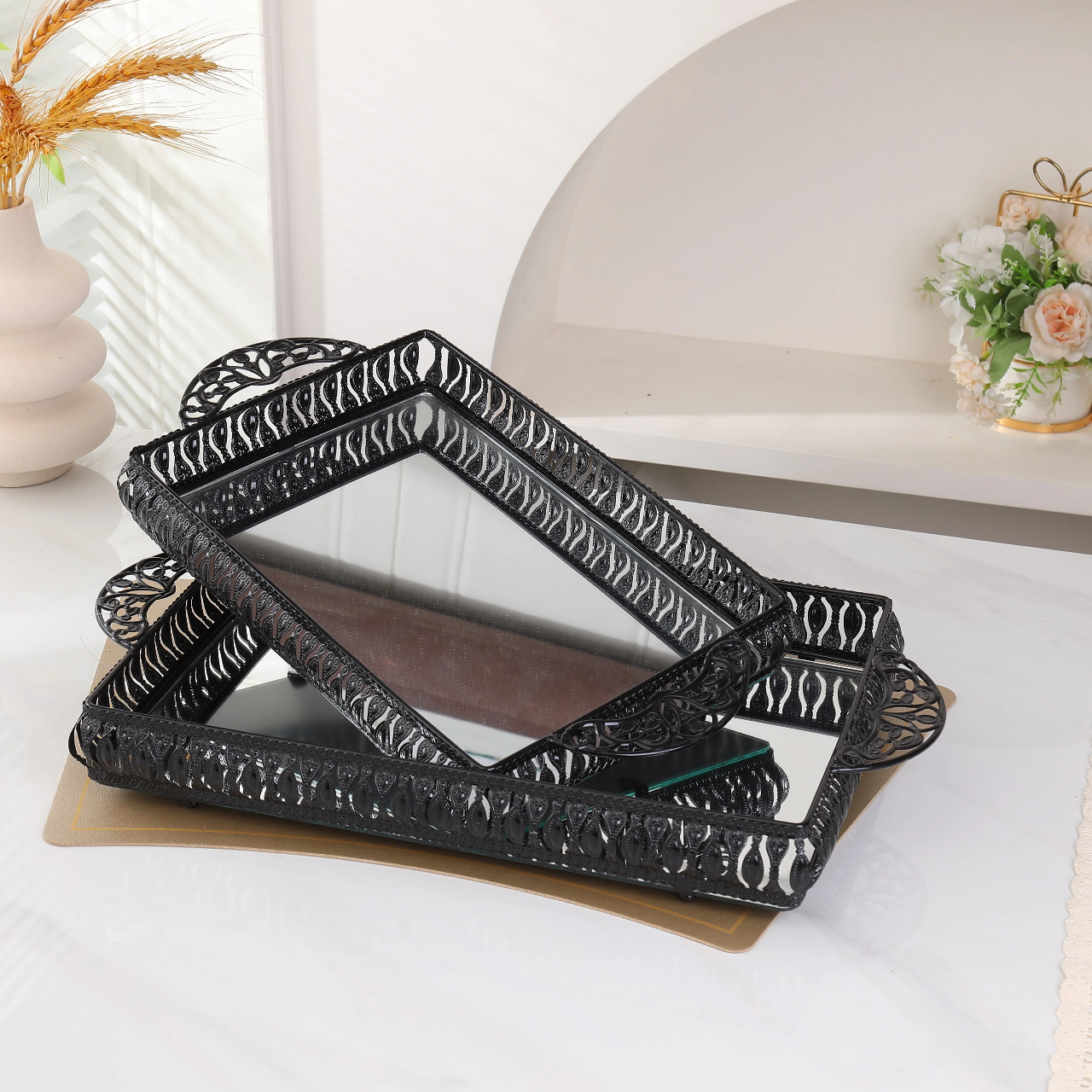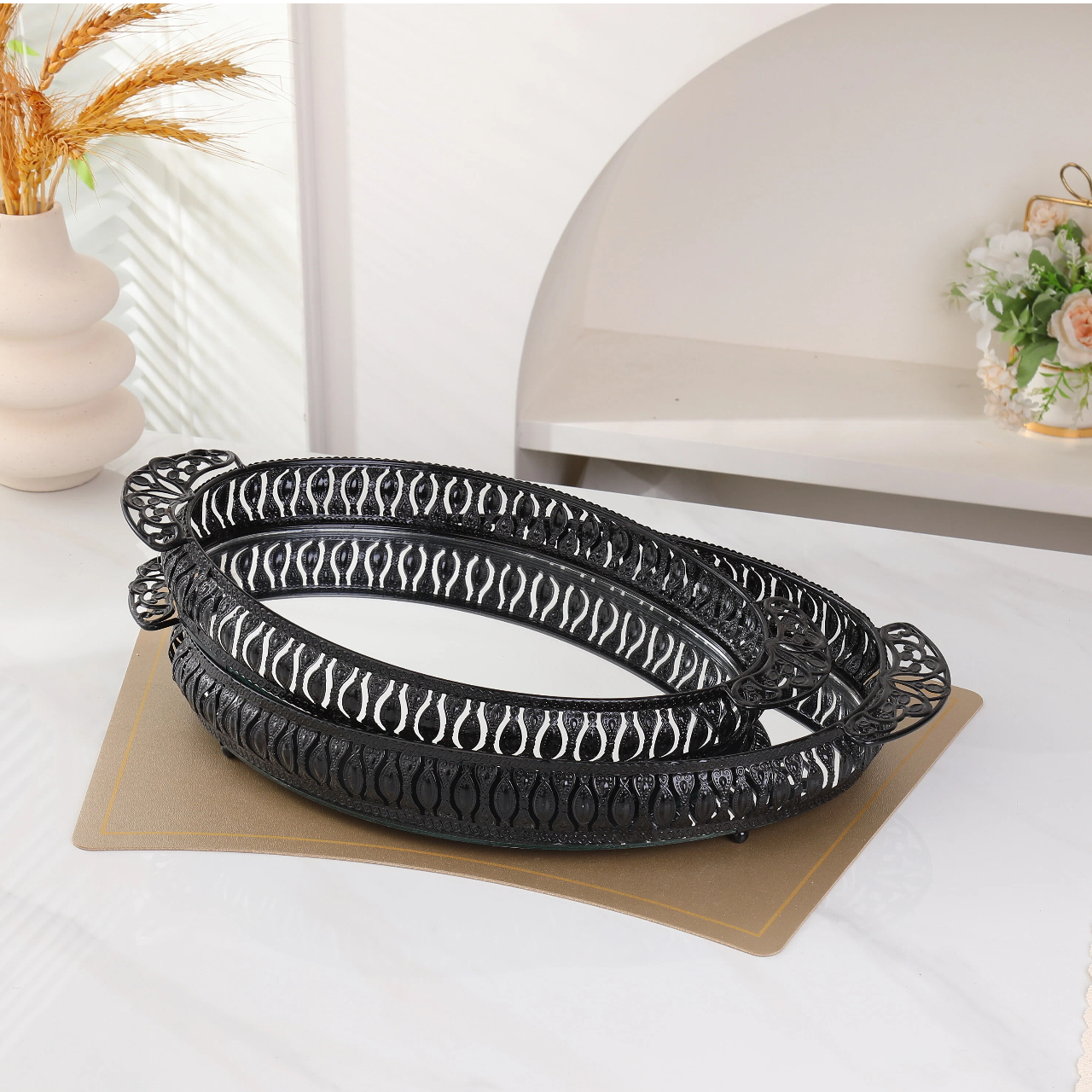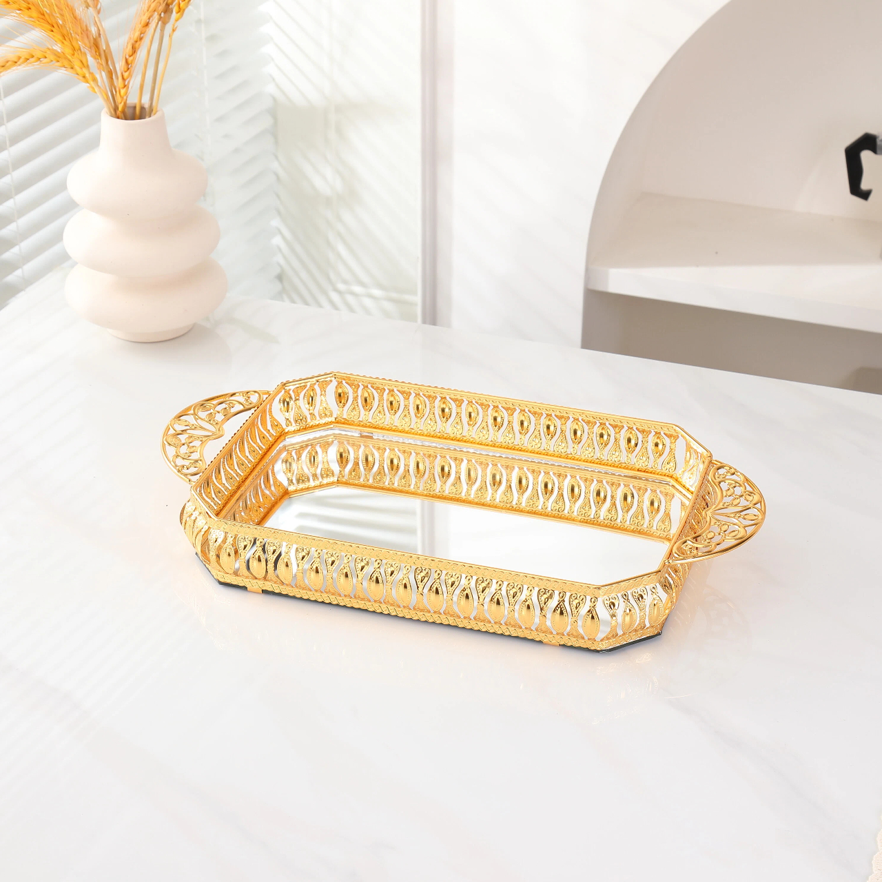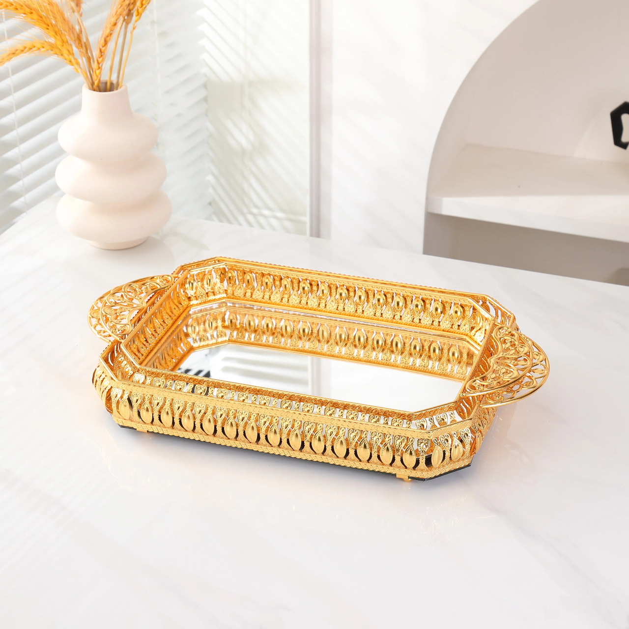 Это коллекция металлических подносов в ярко выраженном европейском стиле роскоши. Изготовленные из высококачественного сплава, они украшены изысканной ажурной гравировкой и золочением, что придает им роскошный золотистый блеск и нежные цветочные детали. В коллекции представлены подносы различных форм: овальные, круглые и прямоугольные. Некоторые модели дополнены стеклянными или зеркальными подносами, сочетающими практичность и эстетику. Ажурные узоры по краям подносов отличаются замысловатым и изысканным дизайном, а резные ручки придают им изысканный вид.