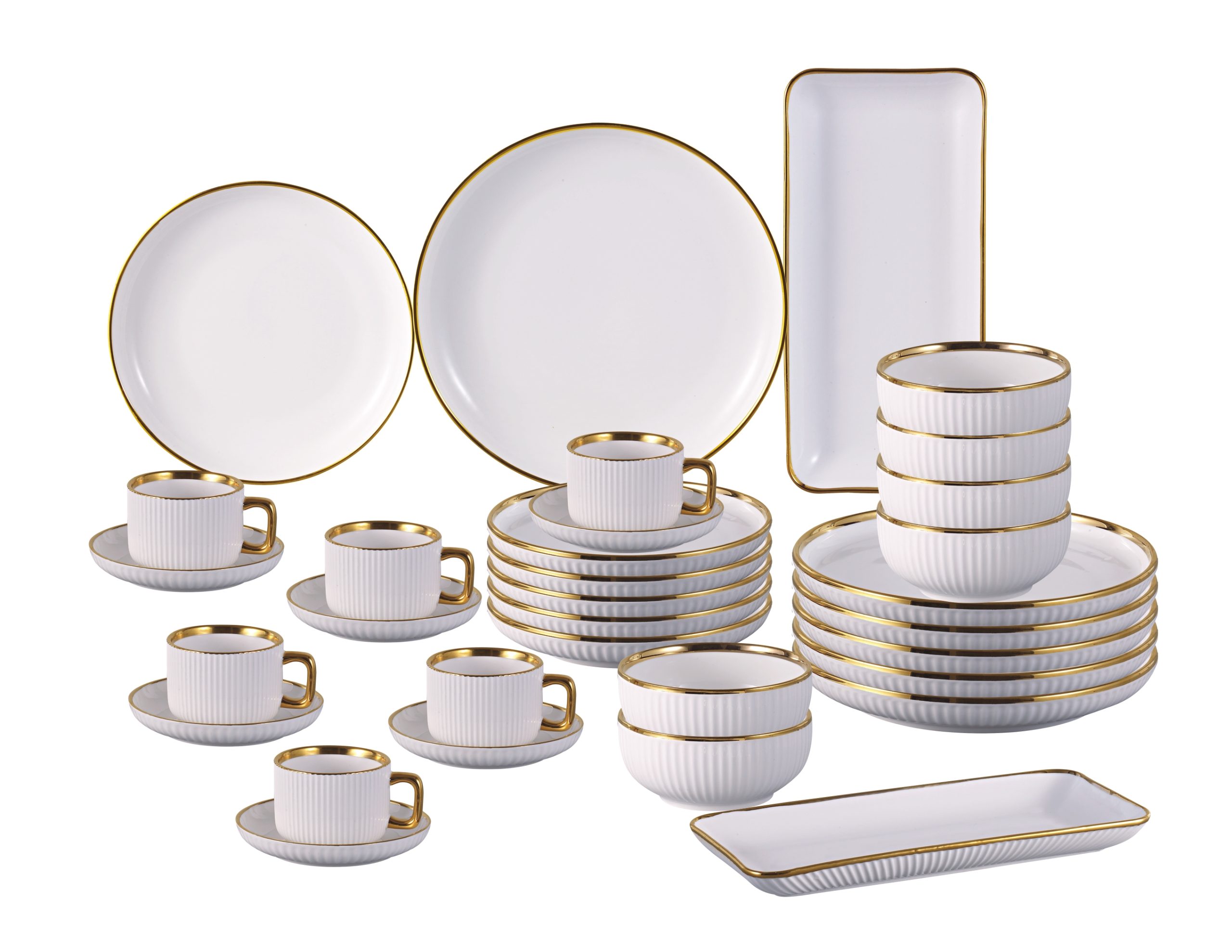 Стиль: Общий дизайн простой и элегантный: белый корпус с золотой отделкой создаёт элегантный, обтекаемый вид. Мы предлагаем тарелки (например, обеденные тарелки и блюда), чашки (кофейные и чайные с блюдцами), миски и прямоугольные подносы различных размеров для удовлетворения различных потребностей в сервировке и сервировке.